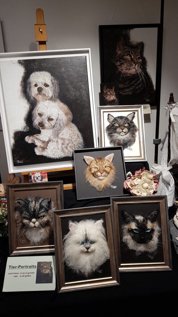 In dieser Galerie erhalten Sie einen Einblick in ausgewählte Arbeiten der Künstlerin. Die gezeigten Werke zeigen unterschiedliche Techniken, Materialien und Stilrichtungen und vermitteln einen Eindruck von der handwerklichen Qualität, der Liebe zum Detail und der künstlerischen Vielfalt der Auftragsarbeiten.